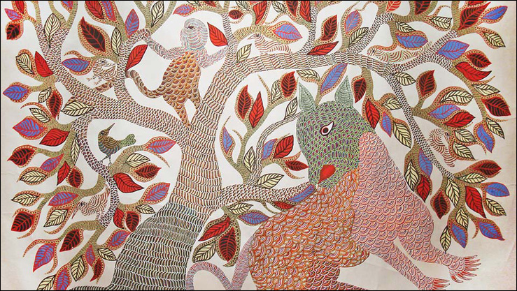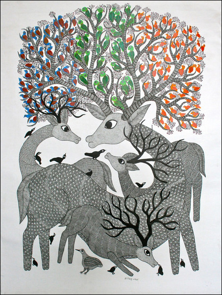 Согласно древним поверьям племени гонд, красивые изображения, несомненно, приносят удачу и отгоняют злых духов. Поэтому традиция украшать стены и полы жилищ стилизованными рисунками сохранилась до сих пор. Гонды, хотя и исповедуют индуизм, остаются приверженцами анимизма, поэтому их картины наделены почтением ко всему окружающему их миру, будь то горы, лес или реки. Некоторые изображения рассказывают историю народа, а также индийские легенды и мифы. Художники рисуют свои картины короткими штрихами и точками. Цвета, используемые в живописи гонд яркие, наполненные живостью. Для красок традиционно используют только натуральные красители, такие как древесный уголь, земля, коровий навоз, сок растертых листьев и цветов. Однако последнее время активно используются бумага, чернила и акриловые краски, что придает картинам долговечность. Благодаря своей уникальности живопись гонд заняла прочное место на мировом рынке. Сегодня спросом пользуются не только настенные панно, но и сувениры (ручки, чашки и всякие безделушки), расписанные в этой технике.