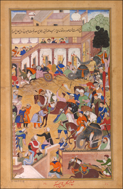 Под покровительством императоров Акбара, Джахангира и Шах Джахана могольская школа живописи поднимается на новую ступень своего развития. Во времена правления Акбара Великого (1556—1605 гг.) отмечался большой рост художественных мастерских. Сотни художников работали при дворе, следуя стилю, основанному двумя персидскими живописцами, прибывшими некогда с Хумаюном в Индию. Поскольку император Акбар обожал легенды и истории, главными темами в этот период были сцены из Махабхараты, Рамаяны и персидских эпосов.