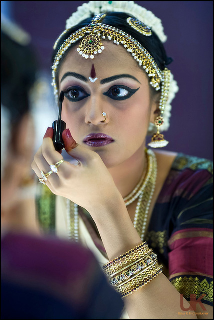 Основной деталью является особый макияж: жирно подведенные глаза, четко очерченные брови. Это позволяет подчеркнуть движения глаз и бровей, сделать их более заметными, поскольку мимика — важная часть танца. Чтобы подчеркнуть движения рук и ног, на кончики пальцев и ступни наносится красная краска. Уникальный комплект украшений добавляет прелести и без того сияющему образу танцовщицы.
