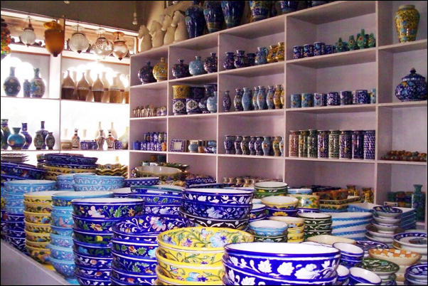 Мудрый правитель привез из Агры искусных гончаров, которые прославили регион изумительной бело-голубой керамикой. Эти предметы хоть и называются керамикой, но сделаны они без использования глины. В их состав входит кварц, известь, бикарбонат соды и фуллерова земля (флоридин). Изделия включают тарелки, вазы, фруктовые чаши, кувшины, мыльницы, глазурованную плитку и многое другое. Главным центром производства голубой керамики в Раджастане является Джайпур (Jaipur). Санганер, Махалан и Неота (Sanganer, Mahalan, Neota.) несколько уступают Джайпуру, однако их изделия также популярны. От изумительно бело-голубых, а порой с бирюзовым оттенком керамических изделий веет духом старинной Индии.
