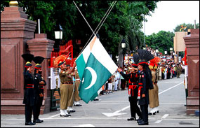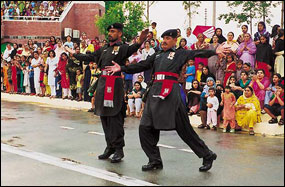 Конечно, специалистами в межнациональных конфликтах мы себя считать не можем, но этот ежедневный ритуал с разматыванием флага и вызывающими взглядами, бросаемыми на противоположную сторону, эта каждодневная маленькая война показались нам своеобразной квинтэссенцией пакистано-индийского конфликта. Как он может кончиться? Зачем тогда так драить до блеска ботинки? И что скажут зрители?..