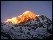 Священная гора Аннапурна (8091 м) расположена в западной части Непала. Аннапурна — Богиня плодородия, супруга Господа Шивы, буквально "богиня зерна". Она защитница земледельцев, и поклоняющиеся ей никогда не будут голодать. Богиня Аннапурна, держащая переполненную чашу с рисом в одной руке и сосуд, до краев наполненный молоком — в другой, восседает на лотосе или на троне. Иногда изображается держащей большую чашу на коленях. |